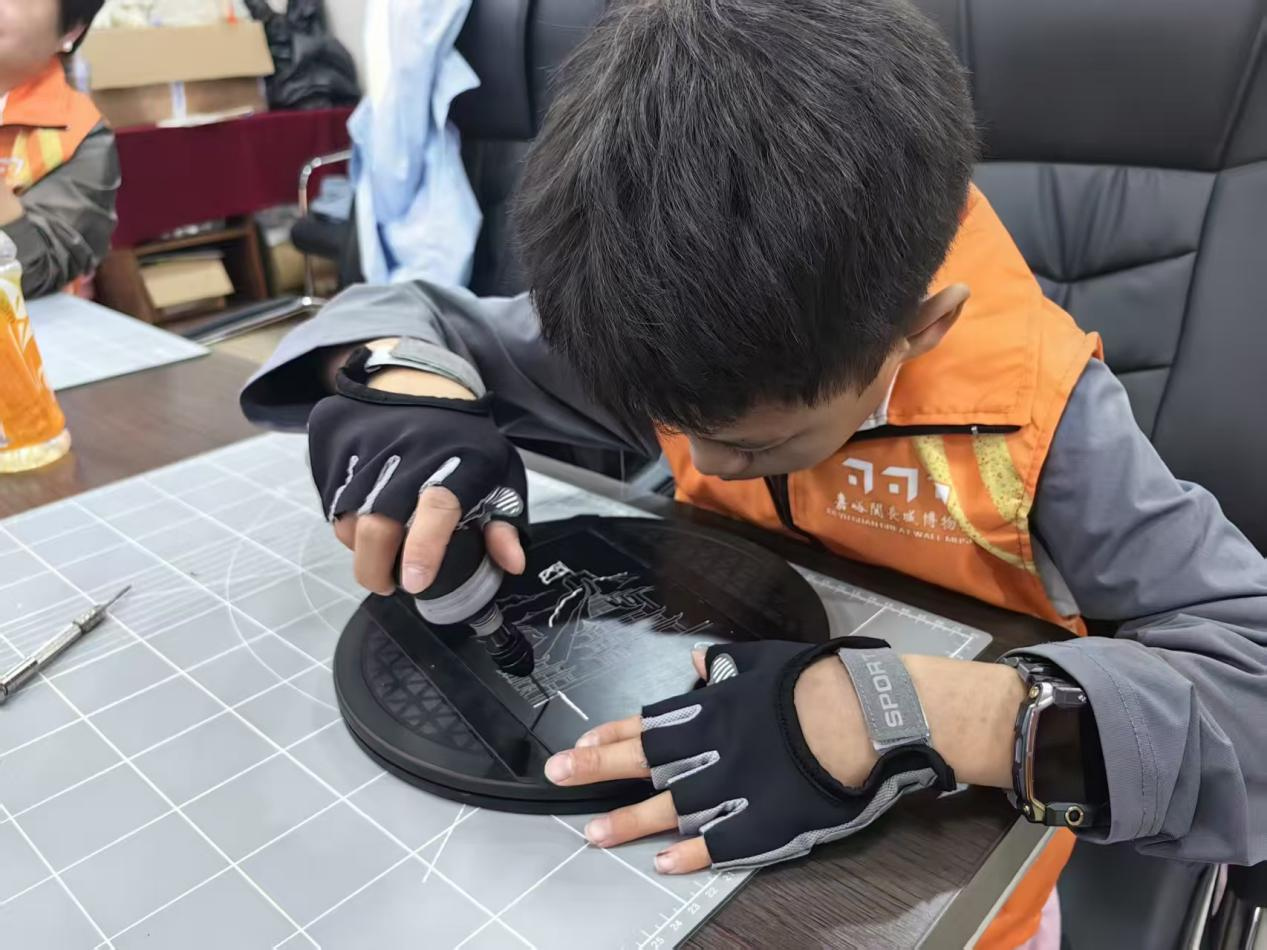 接下来,孩子们在老师的指导下,遵循“画、固、刻、磨”的步骤,先在薄银片上勾勒设计图案,再将银片固定于橡胶垫或木板上以防滑动;随后手持錾刀、刻刀沿线条轻敲刻画让图案在银片上呈现出凹凸纹理,最后用砂纸细细打磨边缘与表面,亲手完成简易的平面银雕作品。在整个制作过程中,孩子们专注投入,在指尖的细致操作里感受到手工创作的乐趣与挑战。
