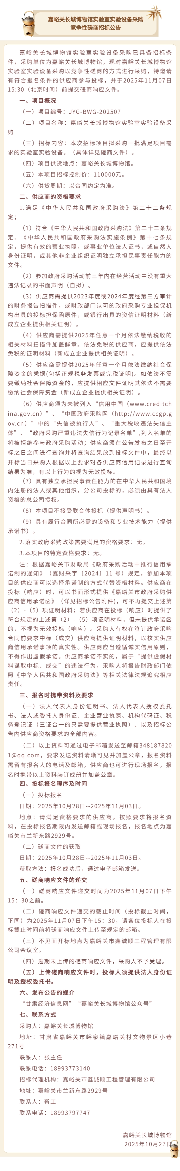 嘉峪关长城博物馆实验室实验设备采购竞争性磋商招标公告