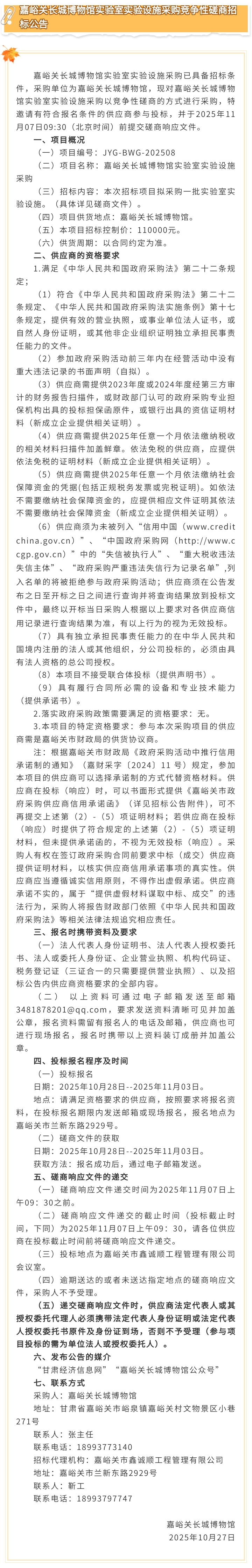嘉峪关长城博物馆实验室实验设施采购竞争性磋商招标公告